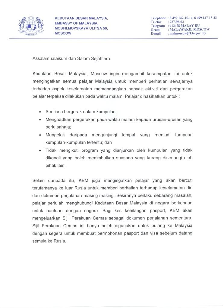 REMINDER FROM THE MALAYSIAN EMBASSY